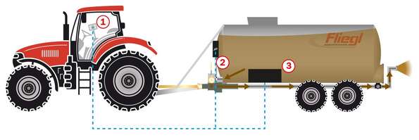 Mit dem Fliegl Slurry Tanker können alle Funktionen des Güllefasses direkt über das ISOBUS-Display des Traktors angezeigt und gesteuert werden. Es ist kein zusätzliches Bedienpult notwendig, was die Kabine aufräumt und die Ergonomie verbessert. Die Bedienung erfolgt intuitiv, sodass auch weniger geübte Fahrer schnell zurechtkommen. Die Daten werden über die ISOBUS-Verbindung an den fest verbauten Job-Rechner weitergegeben, der dann die entsprechenden Signale an den hydraulischen Steuerblock sendet. So wird die gewünschte Hydraulikfunktion am Fass zuverlässig ausgeführt. Dabei bleibt die Steuerung stets nachvollziehbar und logisch aufgebaut.
