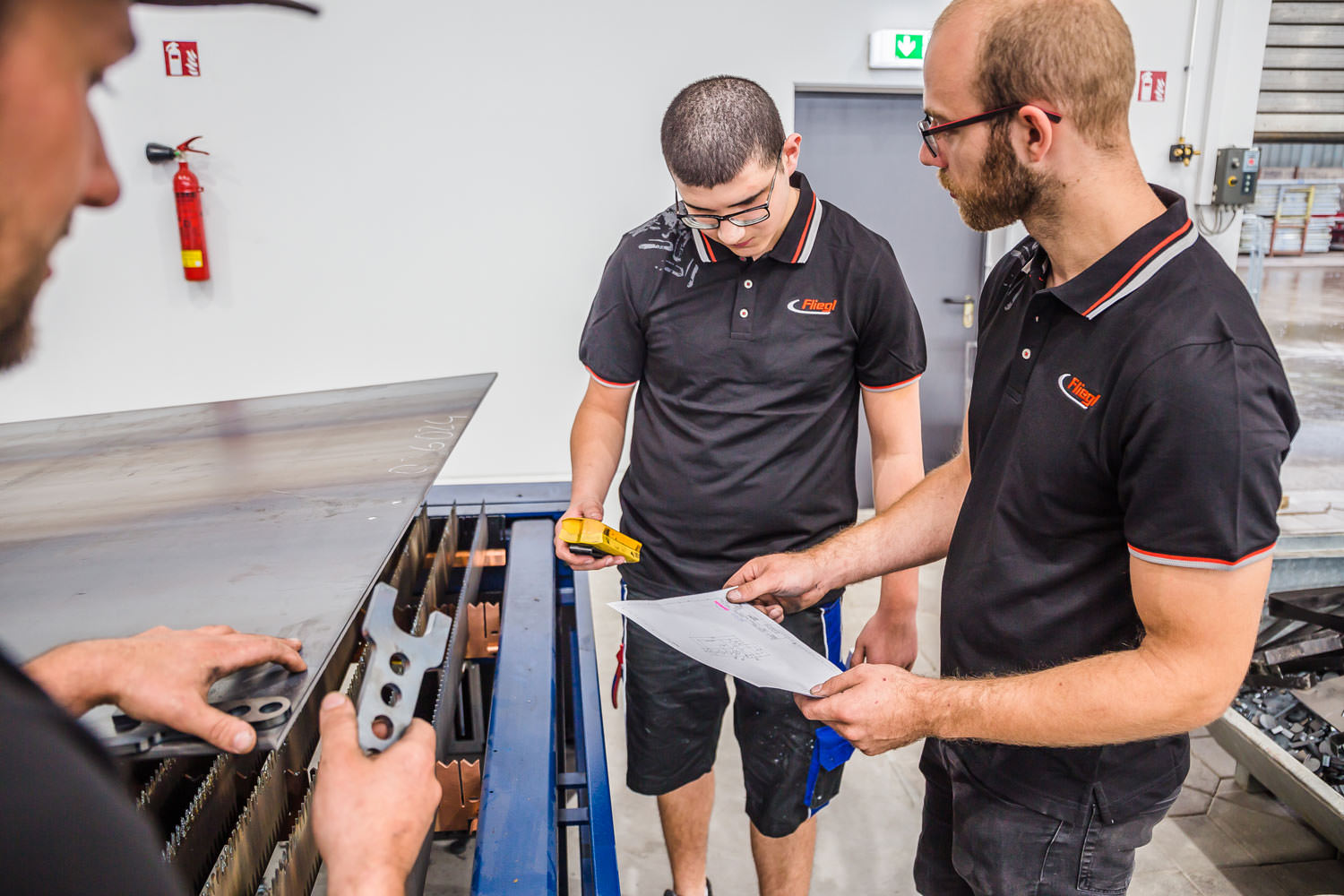 Noch beeindruckender ist die Flachbettlaser-Schneidanlage, wo ein gebündelter Lichtstrahl Bleche durchtrennt, als wären sie aus Butter. Die Präzision ist atemberaubend. Die Auszubildenden arbeiten hier im Team mit dem Roboter. Sie programmieren am PC die Schnittmuster und übertragen sie an die Maschine. Ein gutes räumliches Vorstellungsvermögen ist hier von großem Vorteil, um aus einer zweidimensionalen Zeichnung ein dreidimensionales Bauteil im Kopf entstehen zu lassen. Die Arbeit an diesen Hightech-Anlagen zeigt den jungen Menschen, welche Möglichkeiten die moderne Fertigung bietet und qualifiziert sie für anspruchsvolle Aufgaben, beispielsweise als Verfahrensmechaniker oder in der Arbeitsvorbereitung.