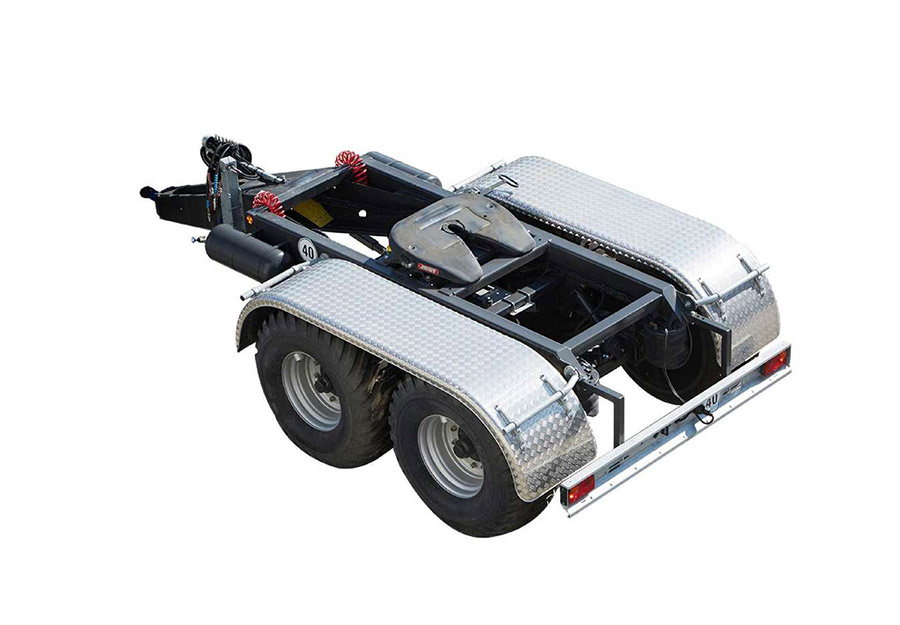 The tandem version of the dolly axle enables a coupling load of 17,000 kg. A hydraulic supporting foot and a mechanically adjustable fifth-wheel coupling are included as standard. The tandem version is equipped with a Titan assembly with parabolic suspension. Air suspension is also available as an option. Customers can also choose between multiple tyre options. With the standard tyres, the smaller version of the dolly axle achieves a coupling height of 1300 mm.