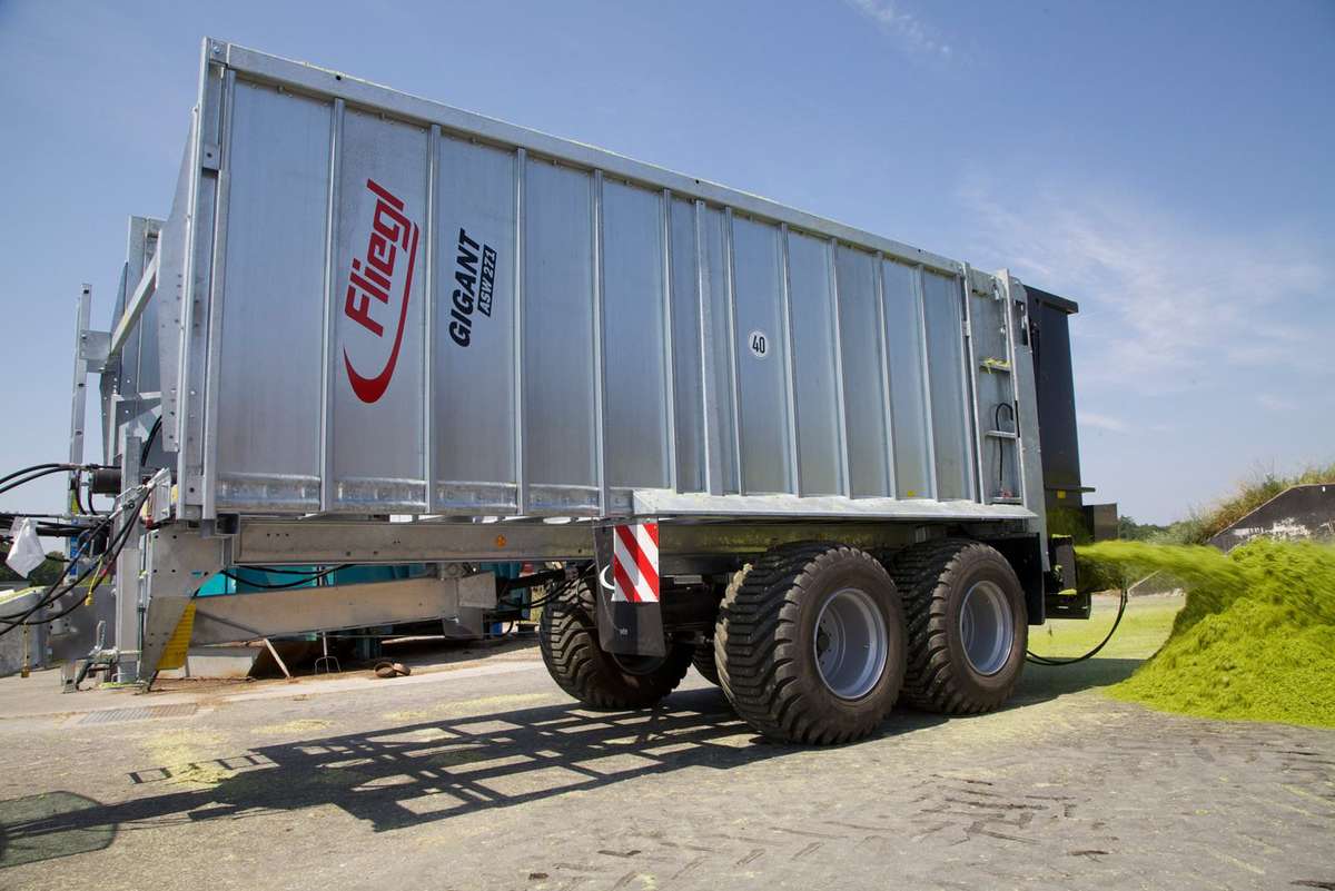 The Fliegl unloading spreader has a high-capacity rear panel with built-in spreader rollers. It can also be extended by a hydraulic cross conveyor for unloading on both sides. This requires either load-sensing hydraulics or on-board hydraulics (optional) and only one double-acting port.