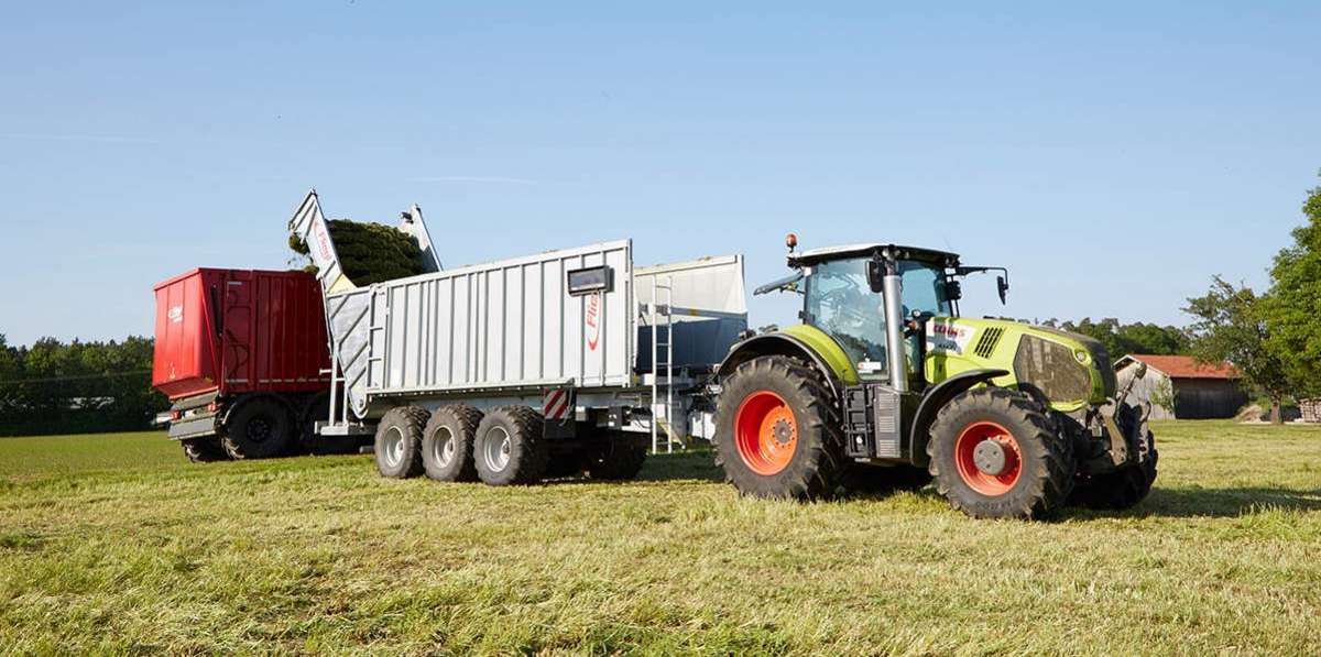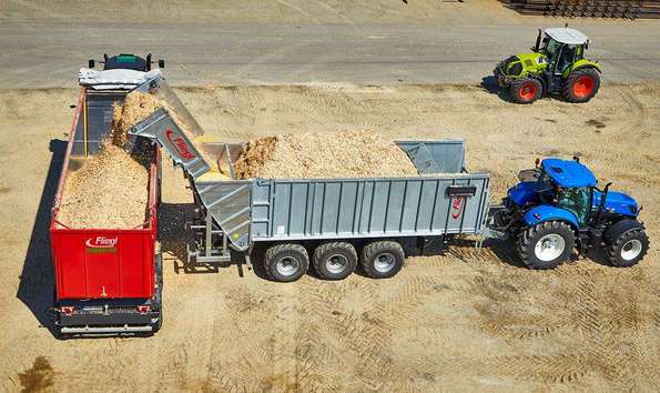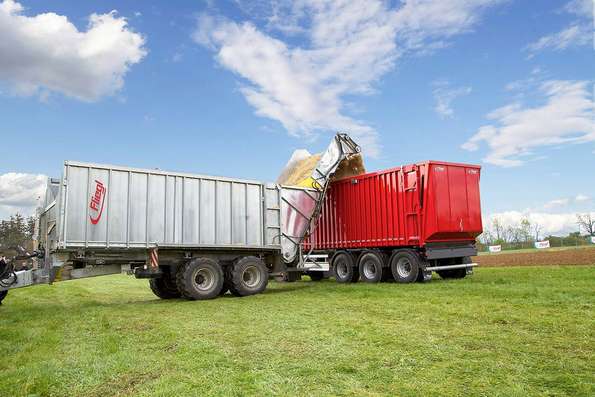 The Fliegl push-off trailer with a hydraulically fold-down transfer unit is extremely powerful.