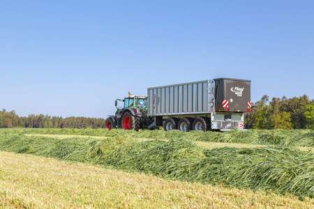 The Fliegl push-off trailer with Tridem chassis is the ultimate solution for transporting very large loads. The heavy-duty Tridem chassis distributes the weight evenly, thereby ensuring high capacity and stability, even on difficult terrain. With its impressive payload, this push-off trailer easily handles even the highest volumes of materials and bulk goods. The advanced push-off mechanism ensures smooth and accurate unloading, which serves to optimise workflows for maximum overall efficiency. The Fliegl push-off trailer with Tridem chassis is the perfect choice for silage work, grain harvests and other high-volume tasks.