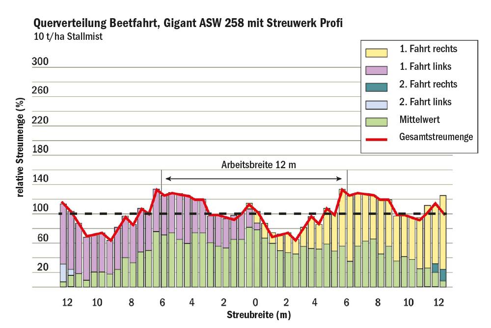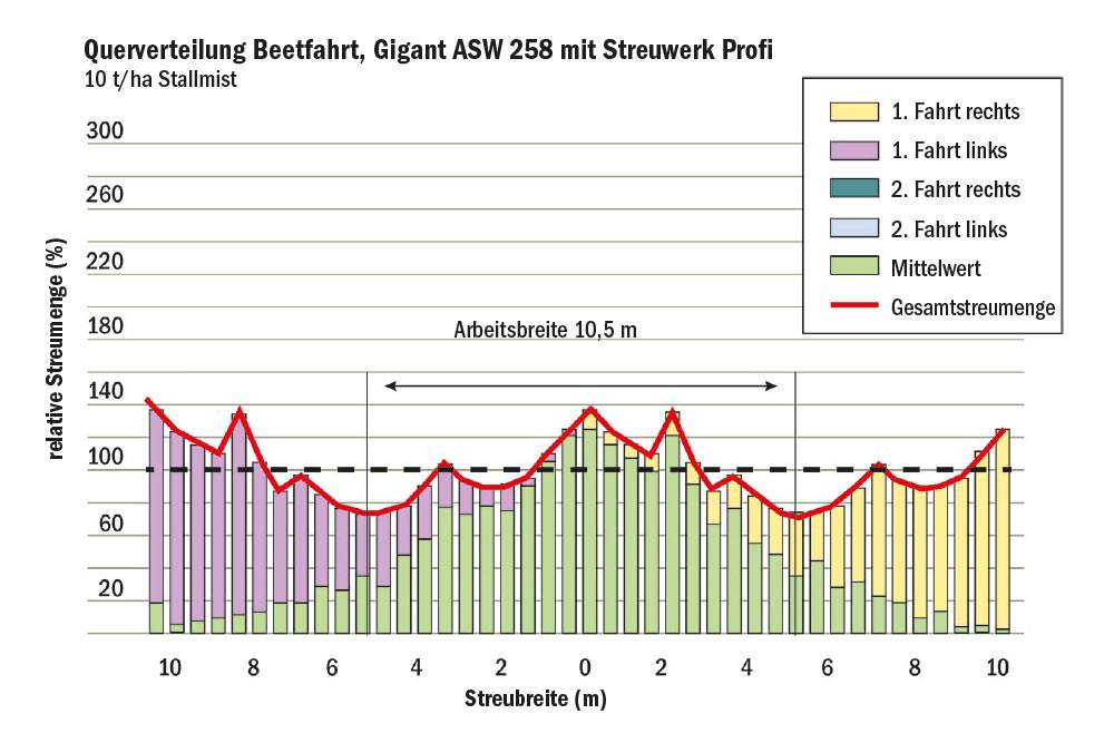 La Deutsche Landwirtschafts-Gesellschaft (société allemande d’agriculture) a testé l’épandeur Profi V2 en combinaison avec l’ASW 271 et lui a attribué le label de contrôle DLG pour la qualité de répartition du fumier d’étable. De bonnes qualités de répartition dans le sens transversal ont été obtenues lors de l’épandage de 10 t/ha, tandis que l’épandage de 30 t/ha a présenté d’excellentes qualités. Dans le sens longitudinal, les coefficients de variation calculés avec des valeurs proches de 10 % peuvent être considérés comme d’excellents résultats. Pour les deux variantes d’équipement et quantités d’épandage, l’extension dans la zone de tolérance atteint un niveau élevé proche de 70 %.