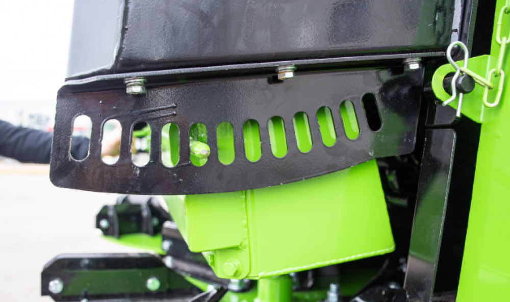 Épandeur à disque varioSPLASH : deux grands disques d’épandage en acier HB 400 résistant à l’usure d’un diamètre respectif de 950 mm avec 6 panneaux d’éjection réglables transversalement par rapport à l’angle d’éjection, plaques remplaçables en acier HB 400 résistant à l’usure et chevilles de sécurité extérieures dont la sensibilité peut être configurée individuellement.
