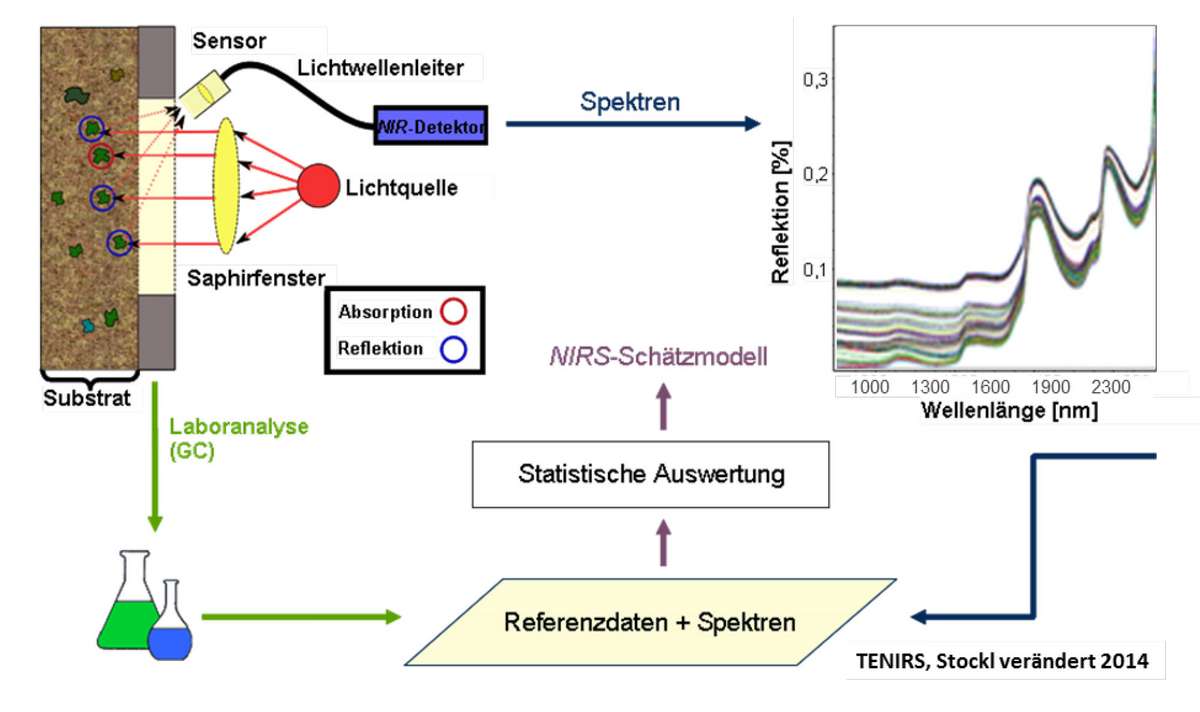 A NIR érzékelő mérőfeje közvetlenül a csatlakozásnál helyezkedik el. Amíg a hígtrágya elfolyik, a NIR szenzor fényt bocsát ki a hígtrágyába. Ugyanakkor a visszavert fény újra felvehető és értékelhető. Az ebből nyert fényhullámok hossza és intenzitása tükrözi a különféle összetevők tartalmát. A fényspektrumot kalibrációs értékek segítségével értékelik. Az adatokat a vezérlő egység dolgozza fel és digitálisan jeleníti meg a gazdálkodó számára.