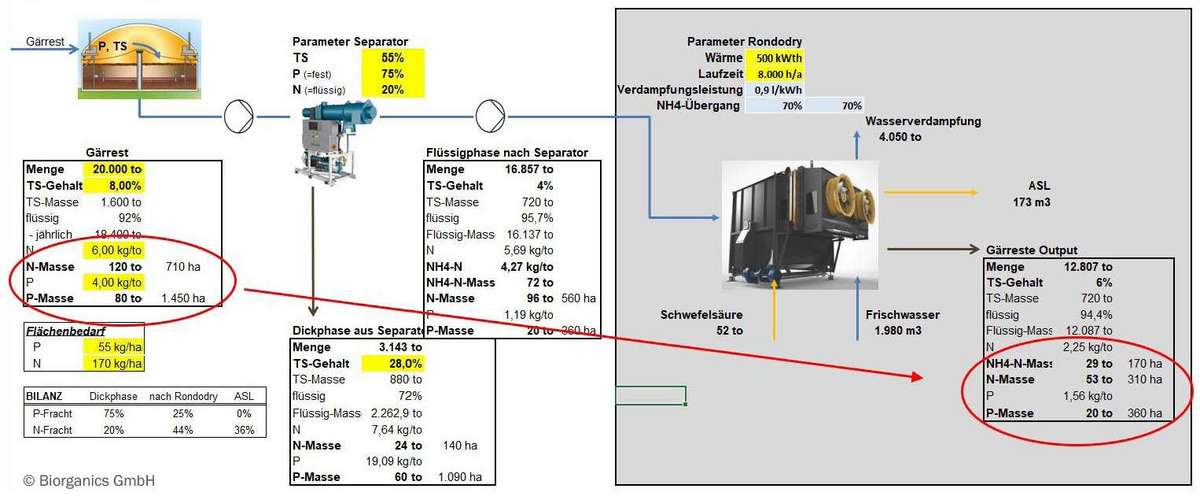 Die Gülle- und Gärrestaufbereitungsanlage RondoDry verdampft bis zu 4.000 m3 Wasser jährlich. Dabei holt der RondoDry bis zu 70% des Ammoniumstickstoffs aus der Gülle und trägt so dazu bei den Gesamtstickstoffgehalt erheblich zu senken. So werden die Flächen entlastet und Transport- und Ausbringkosten erheblich gesenkt. Der Zubau von Lagerkapazität wird vermieden. Nach der Aufbereitung kann die Gülle weiterhin mit der bestehenden Technik ausgebracht werden.