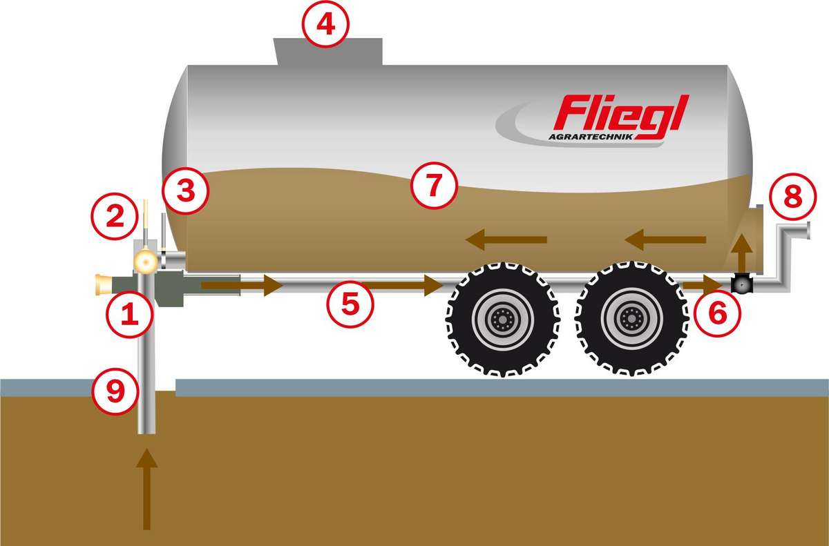 Für den Ansaugvorgang beim Pumpfass muss der Pumpenschieber geschlossen und der Ansaugschieber geöffnet werden. Durch den Unterdruck, erzeugt durch die Exzenterschneckenpumpe, wird die Gülle aus dem Güllelager in die Exzenterschneckenpumpe gesaugt und von Ihr über die Druckleitung nach hinten gedrückt. Nach richtiger Stellung des am Fass-Ende liegenden Dreiwegeschiebers füllt sich der Gülletank von der Rückseite.