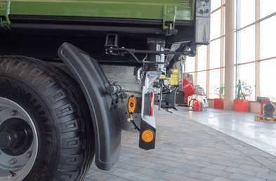 Если самосвал необходимо опрокинуть вбок, необходимо соответственно снять фиксатор соответствующей стороны сзади и закрепить спереди на противоположной стороне. При приведении в действие распределителя активируется опрокидывающий цилиндр, и самосвал опрокидывается в необходимую сторону