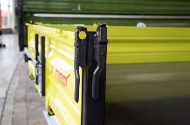 Если вы хотите опрокинуть самосвал назад, необходимо убедиться, что боковые стенки правильно зафиксированы. Соответственно, на передних двух защелках не должно быть фиксаторов.