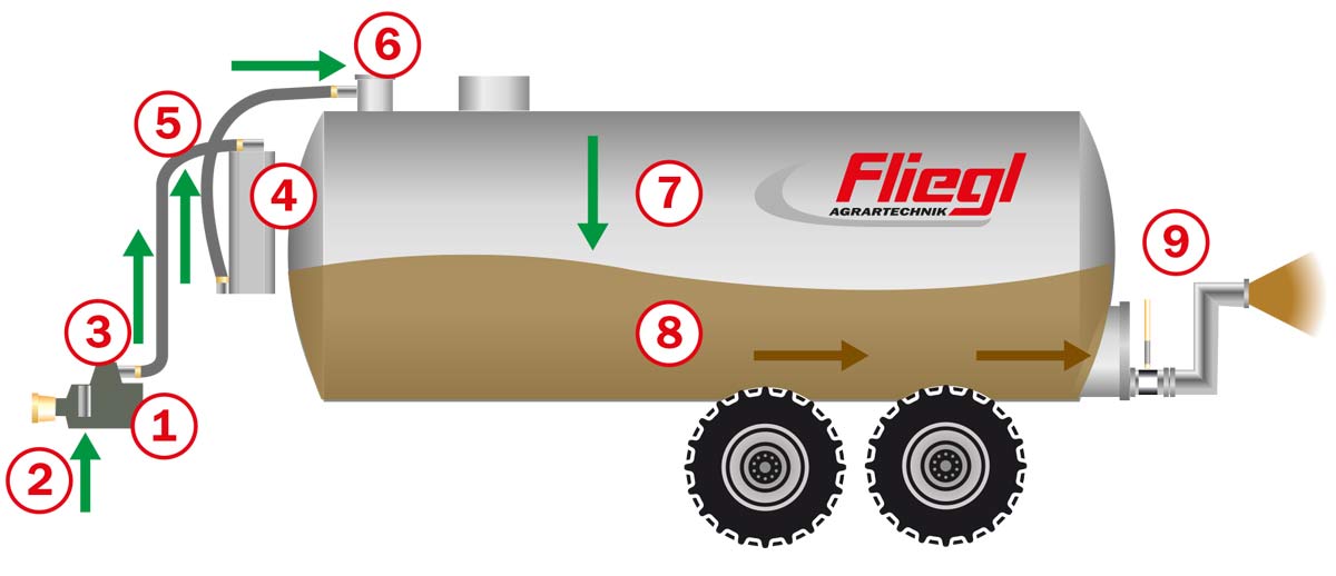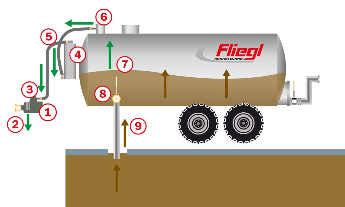 Ansaugen: Steht der Kompressor auf Saugstellung wird im Fassbehälter Unterdruck erzeugt. Durch das entstandene Vakuum wird das Substrat in das Fass gesaugt. Der Siphon in Kombination mit dem Schaumabscheider verhindert ein Übersaugen der Gülle in den Kompressor.