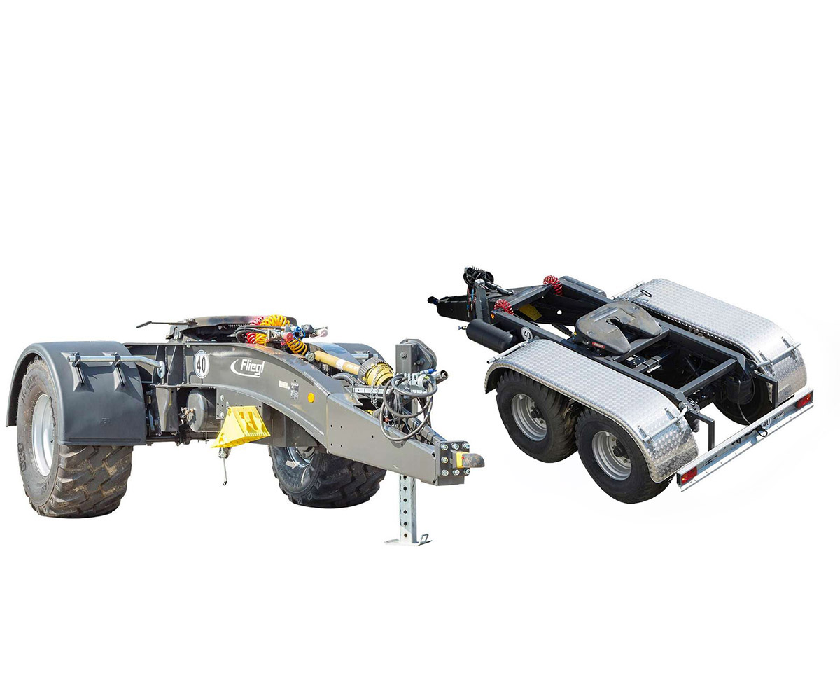 In der Tandem Ausführung der Dolly-Achse ist eine Aufsattellast von 17.000 kg möglich. In Serie ist ein hydraulischer Stützfuß sowie eine mechanisch verstellbare Sattelkupplung integriert. Verbaut ist in der Tandemausführung serienmäßig ein Titan-Aggregat mit Parabelfederung. Optional kann eine Luftfederung gewählt werden. Auch mehrere Bereifungsmöglichkeiten stehen zur Auswahl. Mit Standardbereifung kommt die kleine Version der Dolly-Achse auf eine Aufsattelhöhe von 1300 mm.